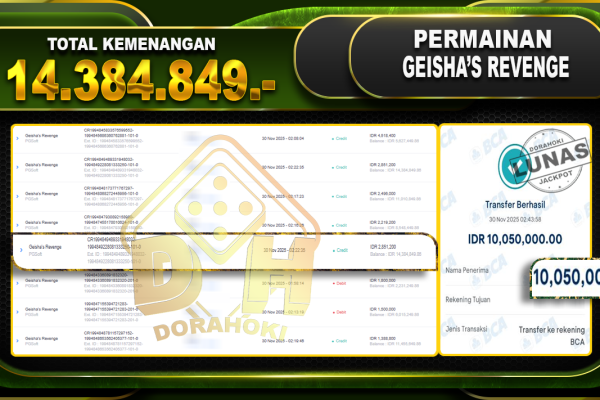 Bukti JP Geisha’s Revenge – ucapkan selamat kepada user id bawxx atas kemenangan di Geisha’s Revenge dengan total kemenangan Rp.14,384,849,- . Yang pasti nya langsung LUNAS sesuai bukti ya bosku. Dorahoki nih bosku berapapun akan tetap kami bayar lunas ya bosku. Kami mengucapkan Terima Kasih telah mempercayakan DORAHOKI sebagai Bandar Online pilihan dalam bermain judi online….