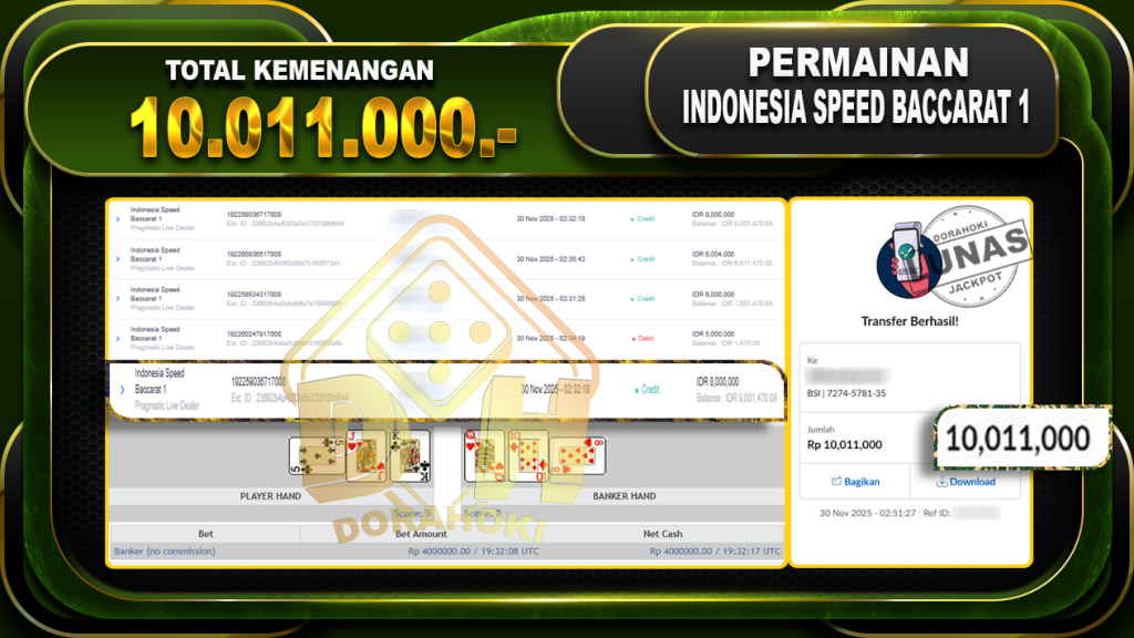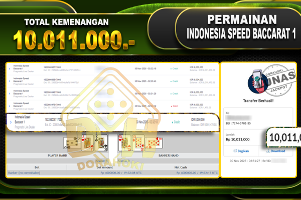 Bukti JP Indonesia Speed Baccarat 1 – ucapkan selamat kepada user id praxxxxx atas kemenangan di Indonesia Speed Baccarat 1 dengan total kemenangan Rp.10.011,000,- Yang pasti nya langsung LUNAS sesuai bukti ya bosku. Dorahoki nih bosku berapapun akan tetap kami bayar lunas ya bosku