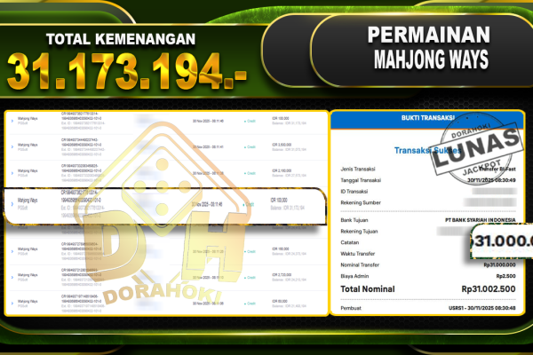 Bukti JP Mahjong Ways – ucapkan selamat kepada user id kirxxxxx atas kemenangan di Mahjong Ways dengan total kemenangan Rp.31.173.194,- Yang pasti nya langsung LUNAS sesuai bukti ya bosku. Dorahoki nih bosku berapapun akan tetap kami bayar lunas ya bosku