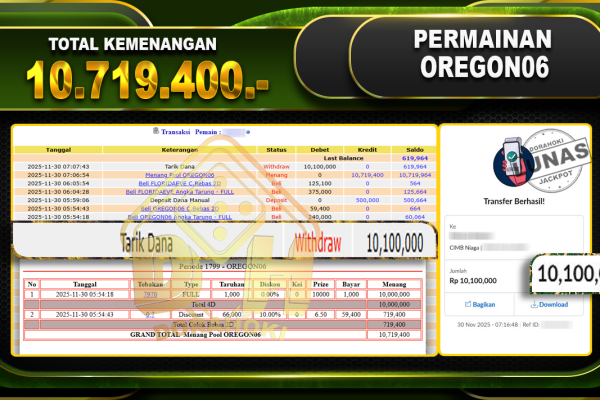 Bukti JP TOGEL OREGON06 – ucapkan selamat kepada user id alixxxx atas kemenangan di TOGEL OREGON06 dengan total kemenangan Rp.10,719.400,- Yang pasti nya langsung LUNAS sesuai bukti ya bosku. Dorahoki nih bosku berapapun akan tetap kami bayar lunas ya bosku.
