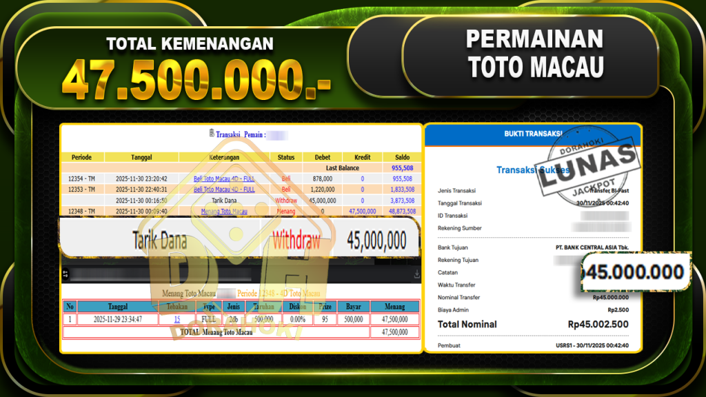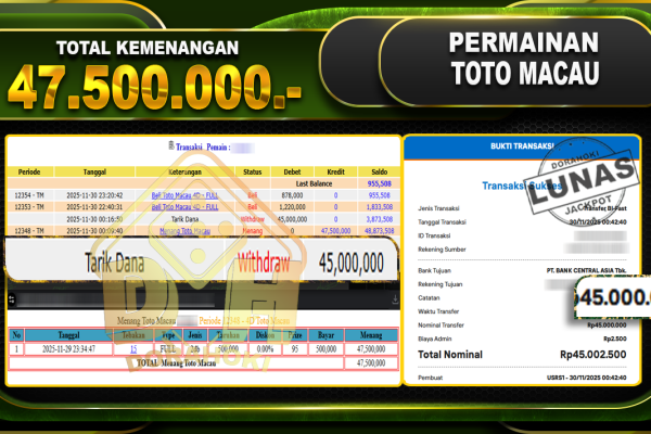Bukti JP TOGEL TOTO MACAU 4D – ucapkan selamat kepada user id aonxxx atas kemenangan di TOGEL TOTO MACAU 4D dengan total kemenangan Rp.47,500,000,- Yang pasti nya langsung LUNAS sesuai bukti ya bosku. Dorahoki nih bosku berapapun akan tetap kami bayar lunas ya bosku