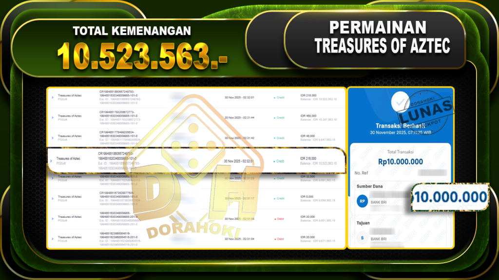 Bukti JP Treasures of Aztec- ucapkan selamat kepada user id silxxxxx atas kemenangan di Treasures of Aztec dengan total kemenangan Rp.10.523.563,- . Yang pasti nya langsung LUNAS sesuai bukti ya bosku. Dorahoki nih bosku berapapun akan tetap kami bayar lunas ya bosku.