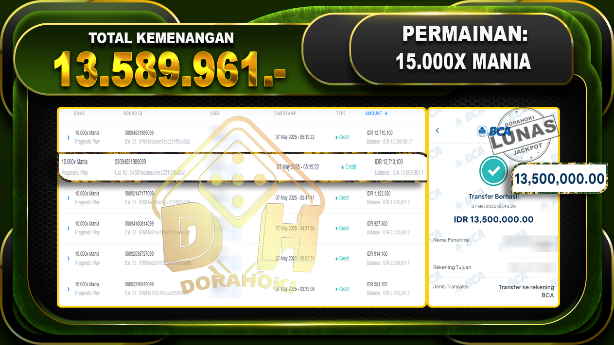Bukti JP 15.000x Mania – Yang kami berikan ini sah dan real tanpa di rekayasa bosku dan hanya bertujuan untuk meningkatkan kepercayaan member kami dan memberikan kenyamanan saat bermain jadi bosku tidak perlu khawatir MENANG BERAPAPUN PASTI KAMI BAYAR LUNAS!!