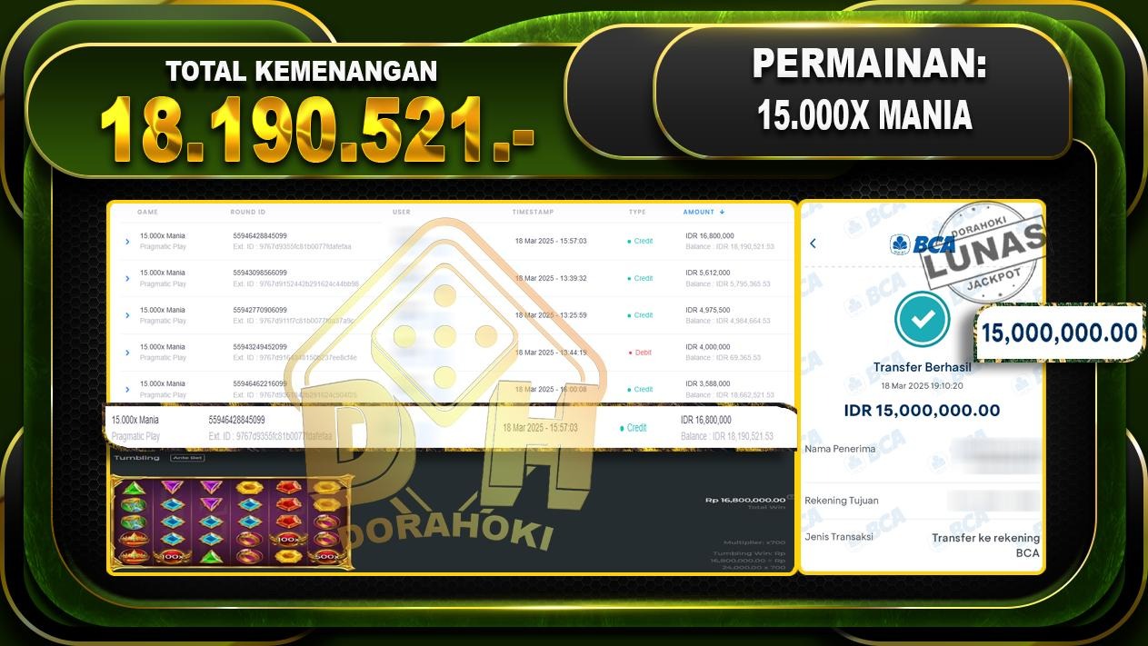 Bukti JP 15.000x Mania – ucapkan selamat kepada user id Gusxxx atas kemenangan di 15.000x Mania dengan total kemenangan Rp.18.190.521,- . Yang pasti nya langsung LUNAS sesuai bukti ya bosku. Dorahoki nih bosku berapapun akan tetap kami bayar lunas ya bosku.