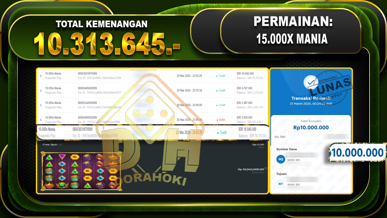 Bukti JP 15.000x Mania – ucapkan selamat kepada user id Ninxxx atas kemenangan di 15.000x Mania dengan total kemenangan Rp.10.313.645,- . Yang pasti nya langsung LUNAS sesuai bukti ya bosku. Dorahoki nih bosku berapapun akan tetap kami bayar lunas ya bosku.