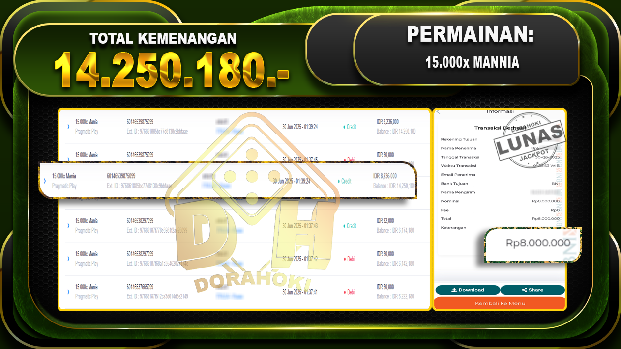 Bukti JP 15.000X MANNIA – ucapkan selamat kepada user id ERIxxx atas kemenangan di 15.000X MANNIA dengan total kemenangan Rp.14.250.180,- . Yang pasti nya langsung LUNAS sesuai bukti ya bosku. Dorahoki nih bosku berapapun akan tetap kami bayar lunas ya bosku.