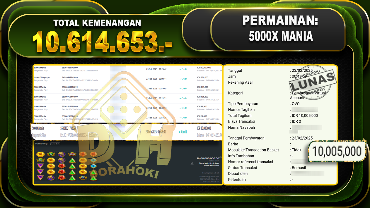 Bukti JP 15000X MANIA – ucapkan selamat kepada user id berkaxxx atas kemenangan di 15000X MANIA dengan total kemenangan Rp.10.614.453,- . Yang pasti nya langsung LUNAS sesuai bukti ya bosku. Dorahoki nih bosku berapapun akan tetap kami bayar lunas ya bosku.