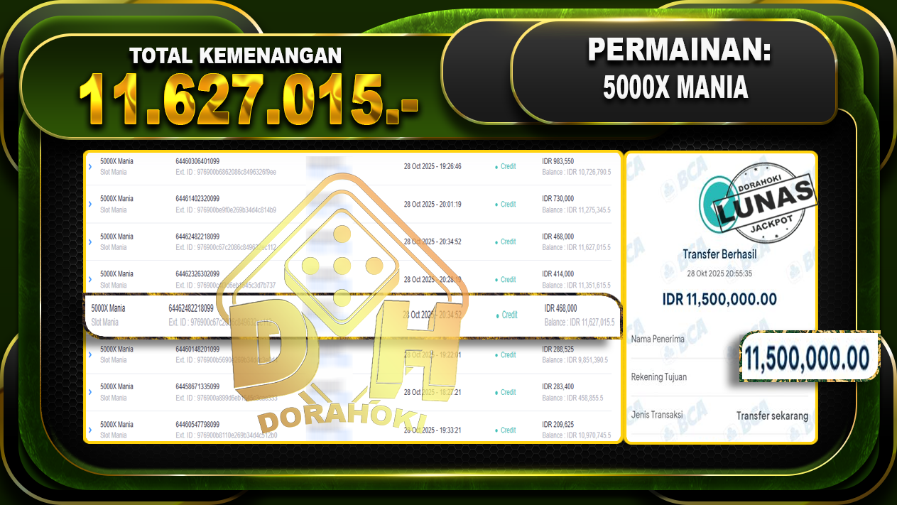 Bukti JP 15000X MANIA – ucapkan selamat kepada user id khsxxxxxxxxx atas kemenangan di 15000X MANIA dengan total kemenangan Rp.11.627.015,- . Yang pasti nya langsung LUNAS sesuai bukti ya bosku. Dorahoki nih bosku berapapun akan tetap kami bayar lunas ya bosku.