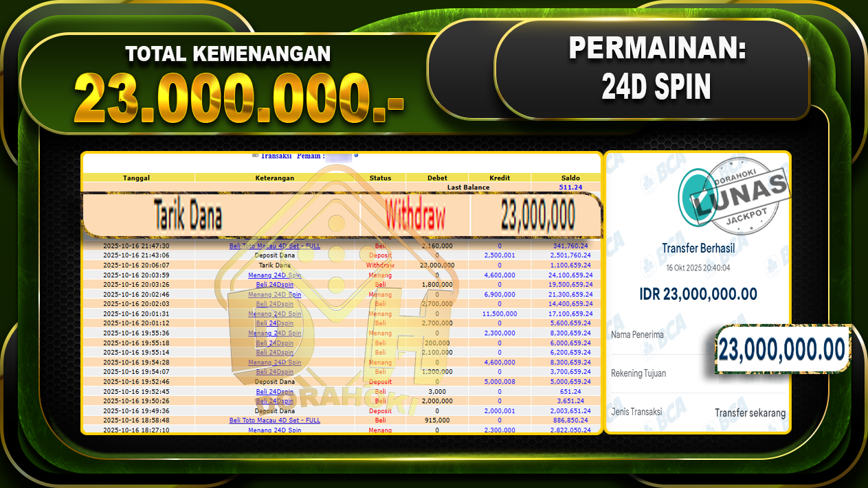 Bukti JP 24D SPIN – ucapkan selamat kepada user id juxxxx atas kemenangan di 24D SPIN dengan total kemenangan Rp.23.000.000,- Yang pasti nya langsung LUNAS sesuai bukti ya bosku. Dorahoki nih bosku berapapun akan tetap kami bayar lunas ya bosku.
