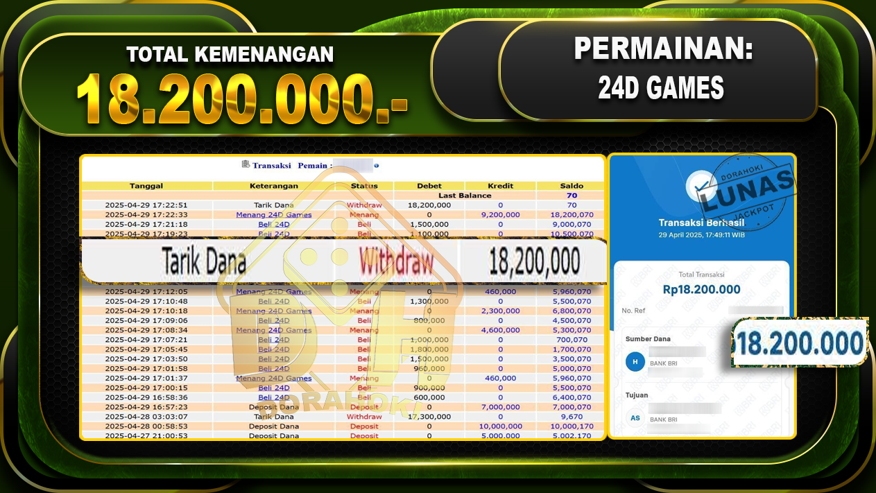 Bukti JP 24D SPIN- ucapkan selamat kepada user id Jemxxx atas kemenangan di 24D SPIN dengan total kemenangan Rp.18.200.000,- . Yang pasti nya langsung LUNAS sesuai bukti ya bosku. Dorahoki nih bosku berapapun akan tetap kami bayar lunas ya bosku.