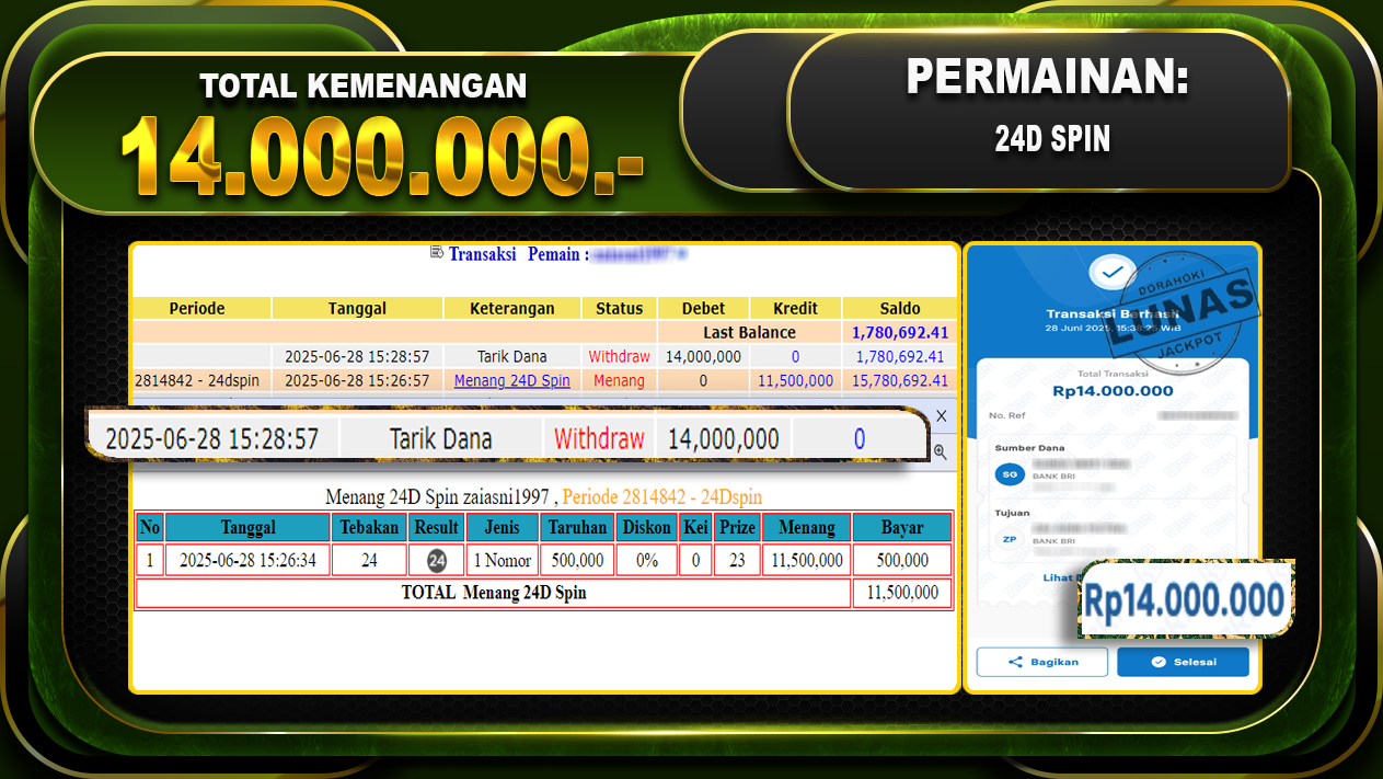 Bukti JP 24D SPIN – ucapkan selamat kepada user id ZAIxxx atas kemenangan di 24D SPIN dengan total kemenangan Rp.14.000.000,- . Yang pasti nya langsung LUNAS sesuai bukti ya bosku. Dorahoki nih bosku berapapun akan tetap kami bayar lunas ya bosku.