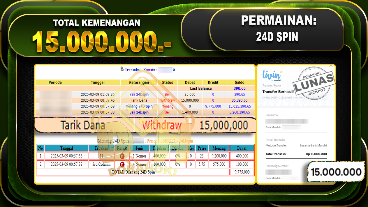 Bukti JP 24Dspin – ucapkan selamat kepada user id Rajxxx atas kemenangan di 24Dspin dengan total kemenangan Rp.15.000.000,- . Yang pasti nya langsung LUNAS sesuai bukti ya bosku. Dorahoki nih bosku berapapun akan tetap kami bayar lunas ya bosku.