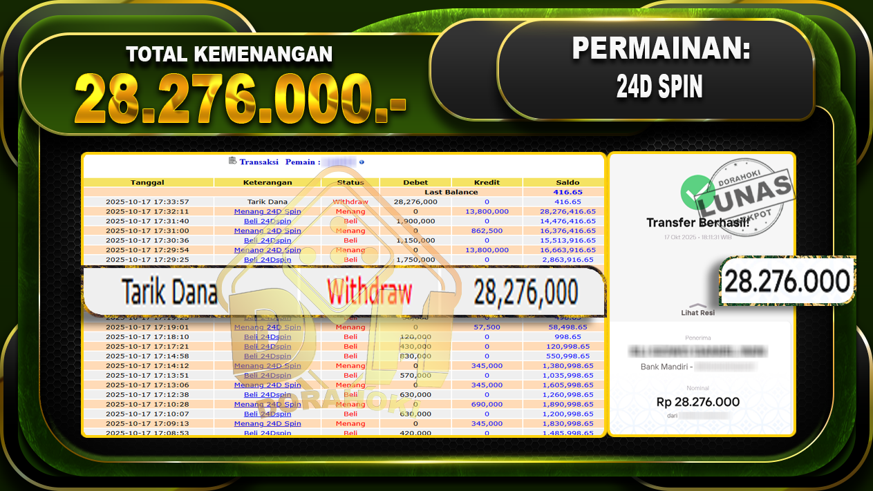 Bukti JP 24Dspin – Yang kami berikan ini sah dan real tanpa di rekayasa bosku dan hanya bertujuan untuk meningkatkan kepercayaan member kami dan memberikan kenyamanan saat bermain jadi bosku tidak perlu khawatir MENANG BERAPAPUN PASTI KAMI BAYAR LUNAS!!