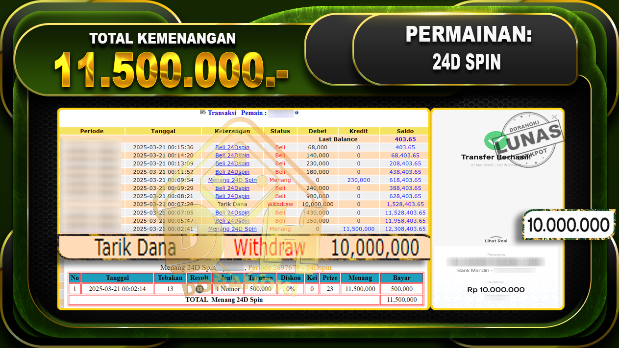 Bukti JP 24Dspin – ucapkan selamat kepada user id Rajxxx atas kemenangan di 24Dspin dengan total kemenangan Rp.11.500.000,- . Yang pasti nya langsung LUNAS sesuai bukti ya bosku. Dorahoki nih bosku berapapun akan tetap kami bayar lunas ya bosku.
