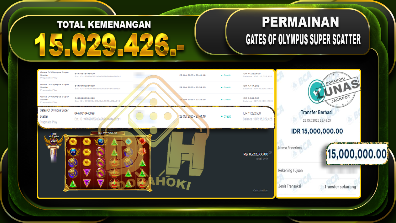 Bukti JP Gates Of Olympus Super Scatter – ucapkan selamat kepada user id ebexxxx atas kemenangan di Gates Of Olympus Super Scatter dengan total kemenangan Rp.15.029.426,- Yang pasti nya langsung LUNAS sesuai bukti ya bosku. Dorahoki nih bosku berapapun akan tetap kami bayar lunas ya bosku