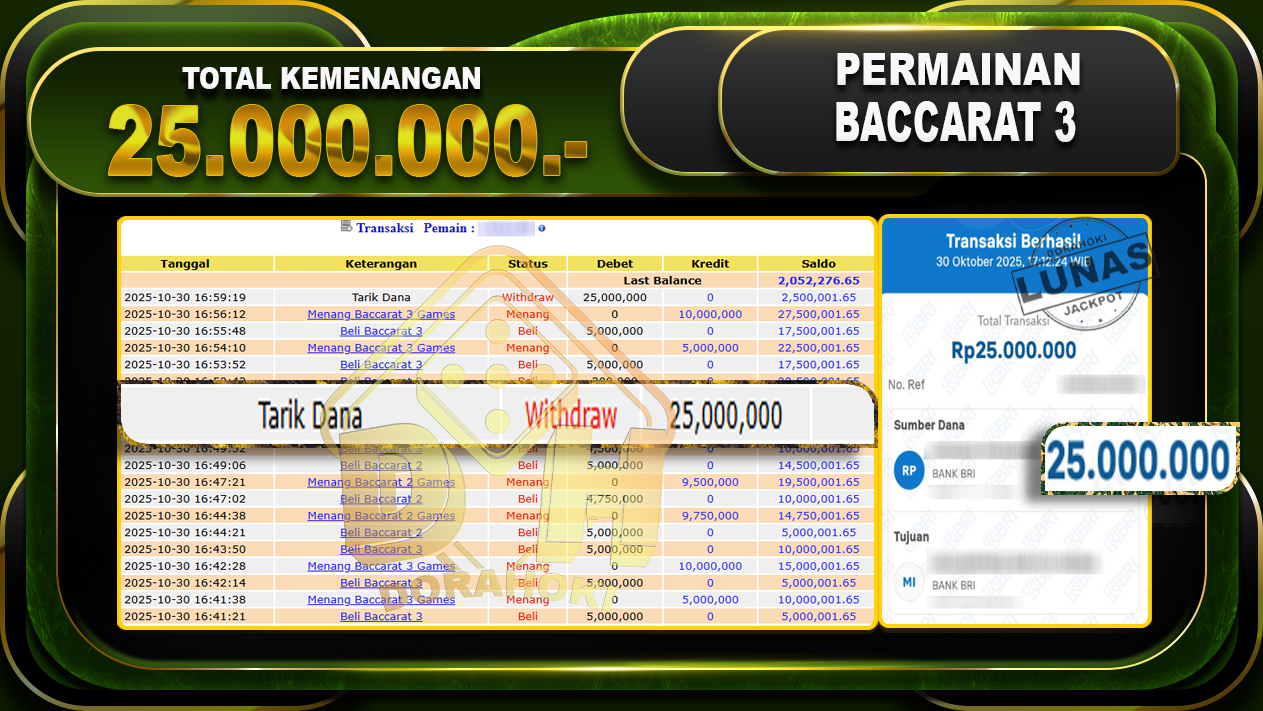 Bukti JP BACCARAT – ucapkan selamat kepada user id arkxxxxx atas kemenangan di BACCARAT dengan total kemenangan Rp.25.000.000,- . Yang pasti nya langsung LUNAS sesuai bukti ya bosku. Dorahoki nih bosku berapapun akan tetap kami bayar lunas ya bosku.