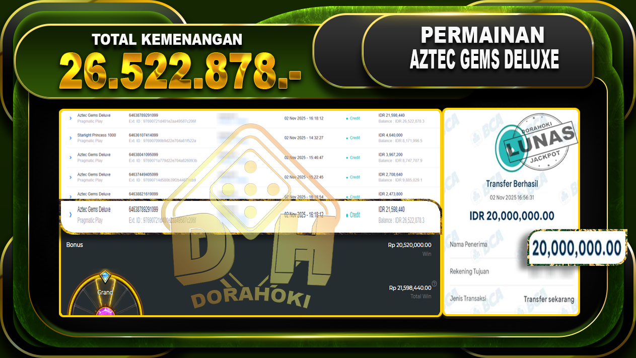 Bukti JP Aztec Gems Deluxe – ucapkan selamat kepada user id Menxxxx atas kemenangan di Aztec Gems Deluxe dengan total kemenangan Rp.26,522,878,- Yang pasti nya langsung LUNAS sesuai bukti ya bosku. Dorahoki nih bosku berapapun akan tetap kami bayar lunas ya bosku