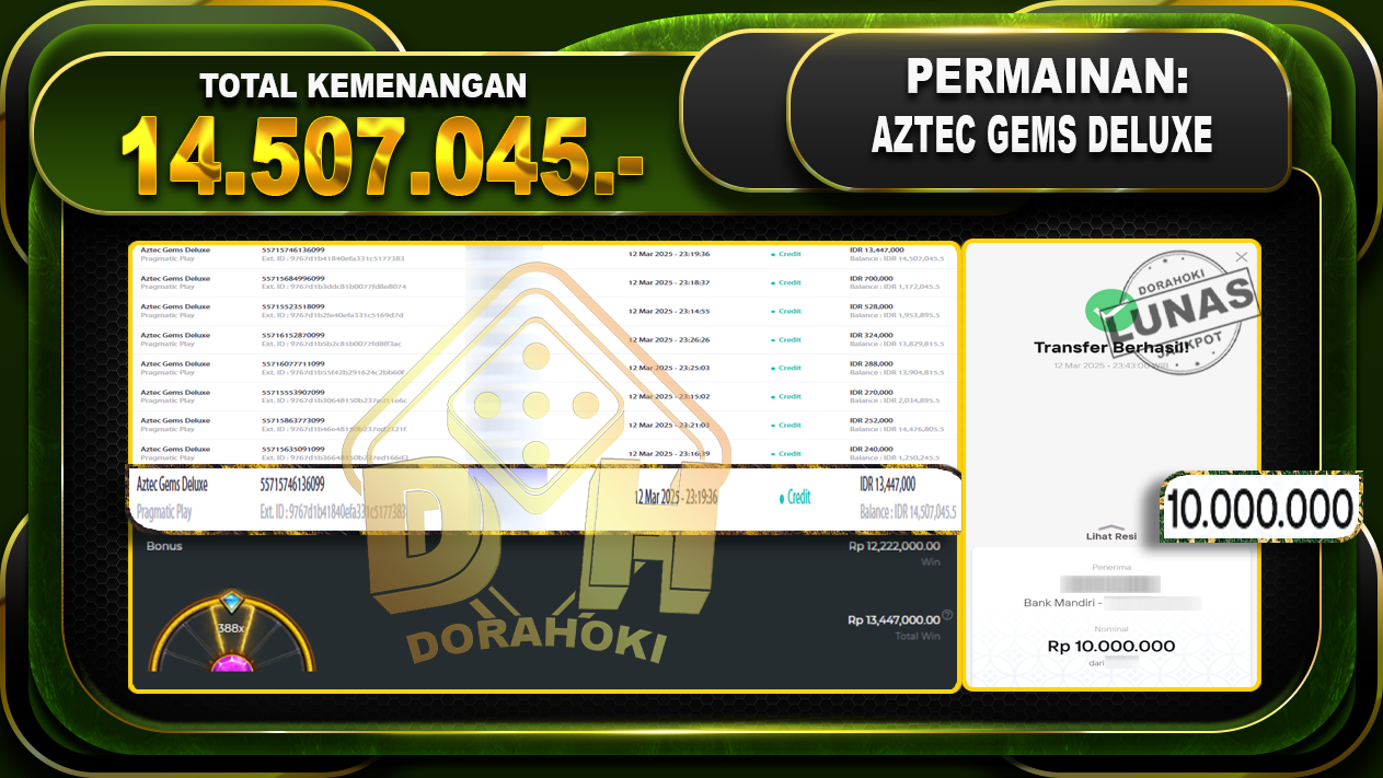 Bukti JP Aztec Gems Deluxe – ucapkan selamat kepada user id Menxxx atas kemenangan di Aztec Gems Deluxe dengan total kemenangan Rp14.507.045,- . Yang pasti nya langsung LUNAS sesuai bukti ya bosku. Dorahoki nih bosku berapapun akan tetap kami bayar lunas ya bosku.