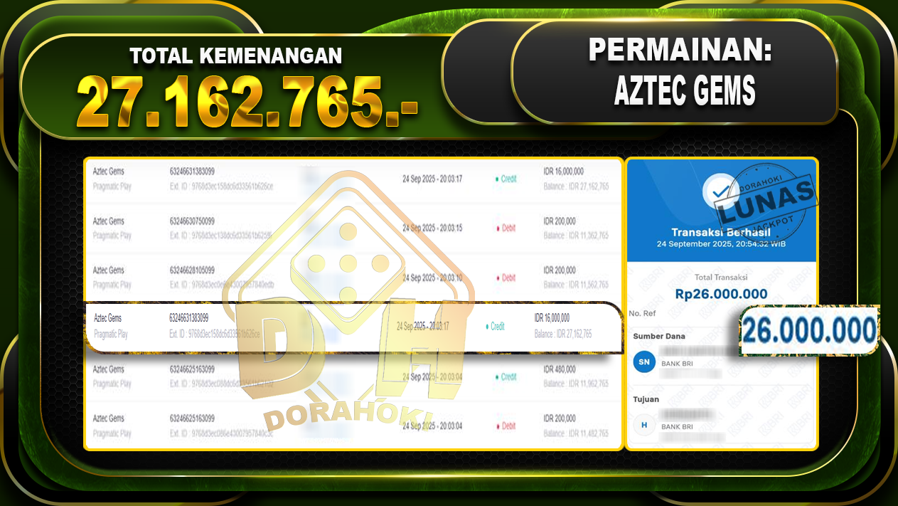 Bukti JP Aztec Gems- ucapkan selamat kepada user id inxxxx atas kemenangan di Aztec Gems dengan total kemenangan Rp.27.162.765,- . Yang pasti nya langsung LUNAS sesuai bukti ya bosku. Dorahoki nih bosku berapapun akan tetap kami bayar lunas ya bosku.