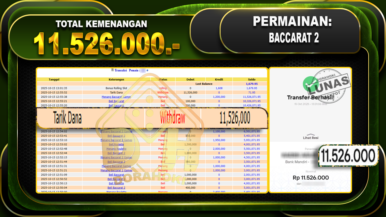 Bukti JP Baccarat 2 – ucapkan selamat kepada user id jixxxx atas kemenangan di Baccarat 2 dengan total kemenangan Rp.11.526.000- . Yang pasti nya langsung LUNAS sesuai bukti ya bosku. Dorahoki nih bosku berapapun akan tetap kami bayar lunas ya bosku.