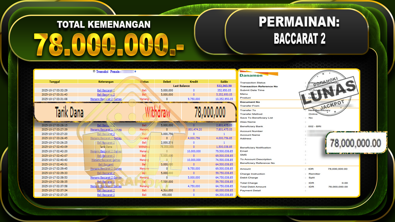 Bukti JP Baccarat 2 – ucapkan selamat kepada user id arkhxxxx atas kemenangan di Baccarat 2 dengan total kemenangan Rp.78.000.000- . Yang pasti nya langsung LUNAS sesuai bukti ya bosku. Dorahoki nih bosku berapapun akan tetap kami bayar lunas ya bosku.