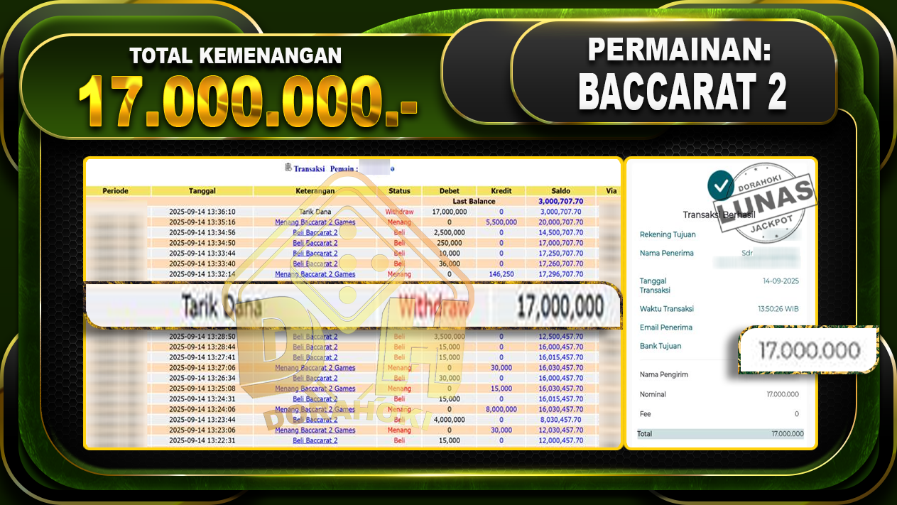 Bukti JP BACCARAT 2 GAMES- ucapkan selamat kepada user id Wahxxxx atas kemenangan di BACCARAT 2 GAMES dengan total kemenangan Rp.17.000.000,- . Yang pasti nya langsung LUNAS sesuai bukti ya bosku. Dorahoki nih bosku berapapun akan tetap kami bayar lunas ya bosku.