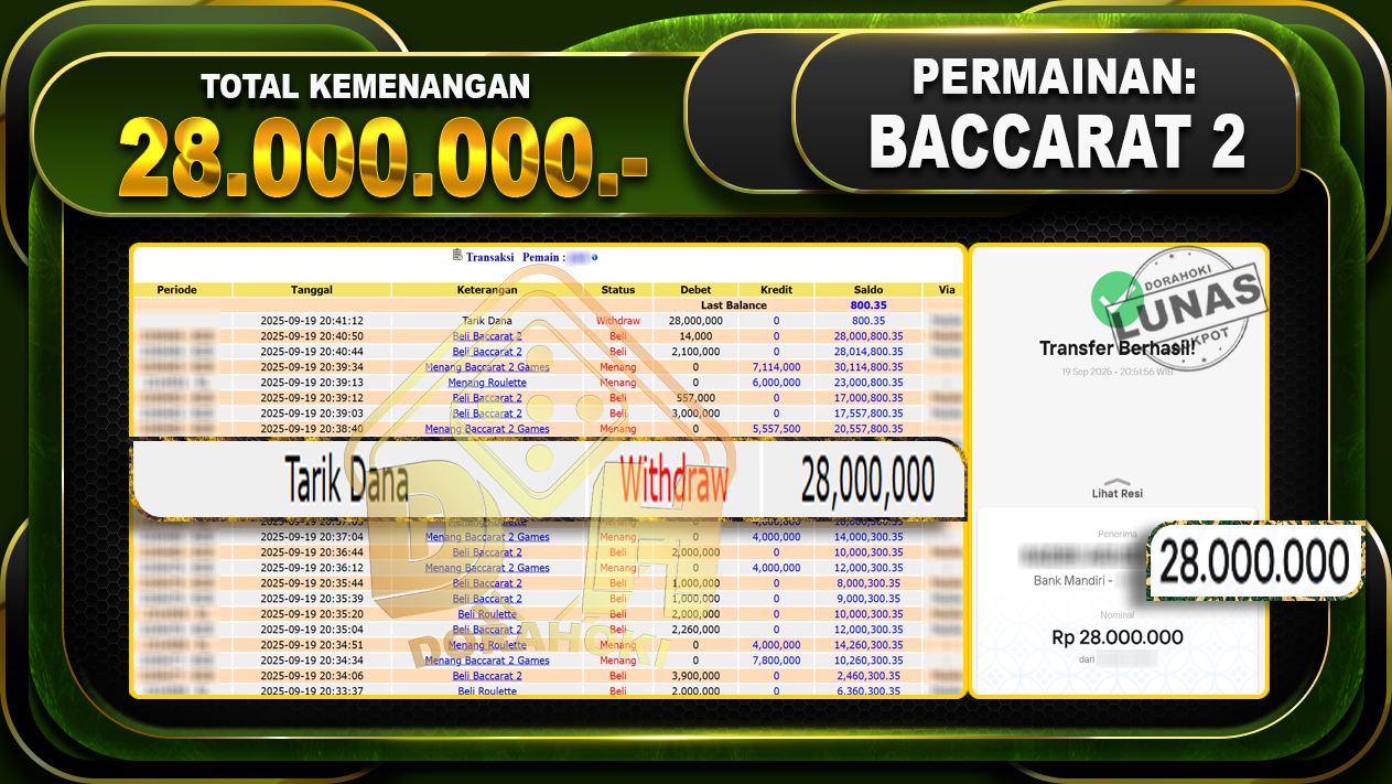 Bukti JP BACCARAT 2 GAMES- ucapkan selamat kepada user id Jixx atas kemenangan di BACCARAT 2 GAMES dengan total kemenangan Rp.28.000.000,- . Yang pasti nya langsung LUNAS sesuai bukti ya bosku. Dorahoki nih bosku berapapun akan tetap kami bayar lunas ya bosku.