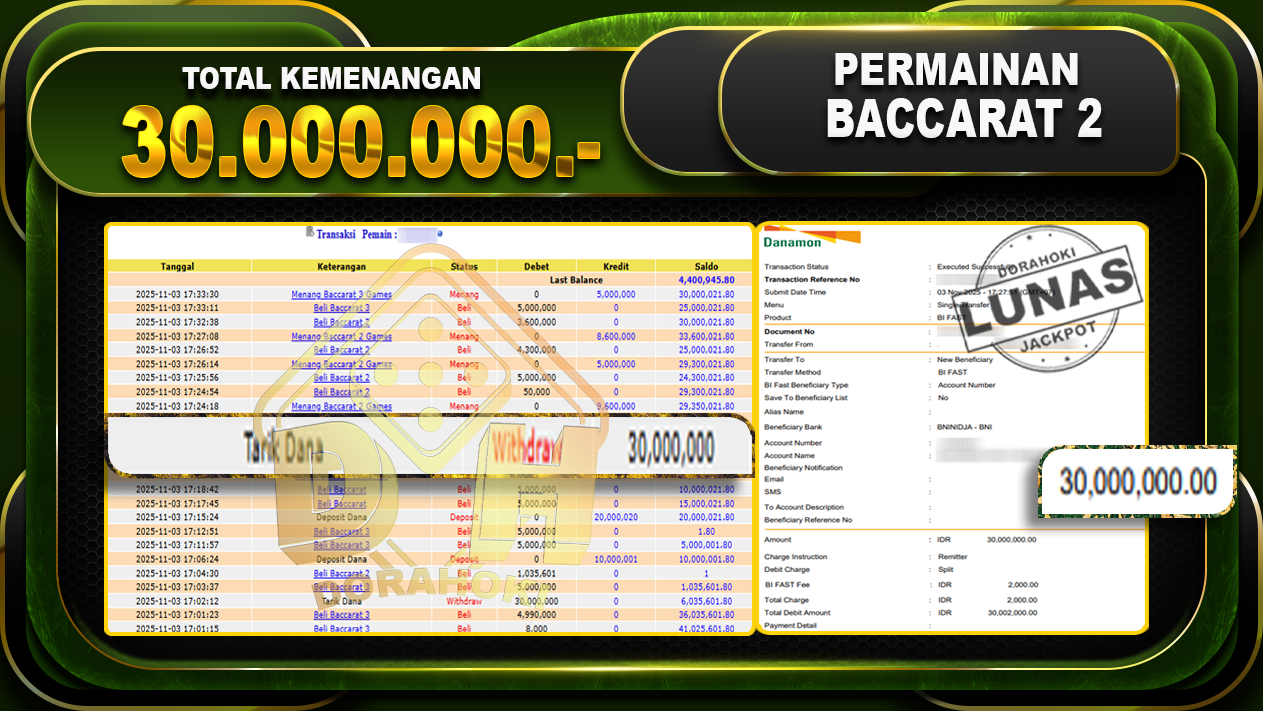 Bukti JP BACCARAT – ucapkan selamat kepada user id wahxxxx atas kemenangan di BACCARAT dengan total kemenangan Rp.30.000.000,- . Yang pasti nya langsung LUNAS sesuai bukti ya bosku. Dorahoki nih bosku berapapun akan tetap kami bayar lunas ya bosku.
