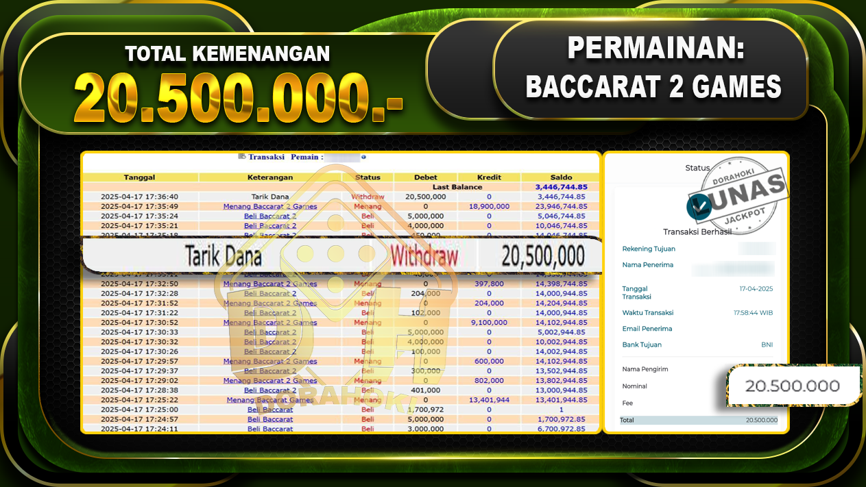 Bukti JP BACCARAT 2 GAMES – ucapkan selamat kepada user id Wahxxx atas kemenangan di BACCARAT 2 GAMES dengan total kemenangan Rp.20.500.000,- . Yang pasti nya langsung LUNAS sesuai bukti ya bosku. Dorahoki nih bosku berapapun akan tetap kami bayar lunas ya bosku.