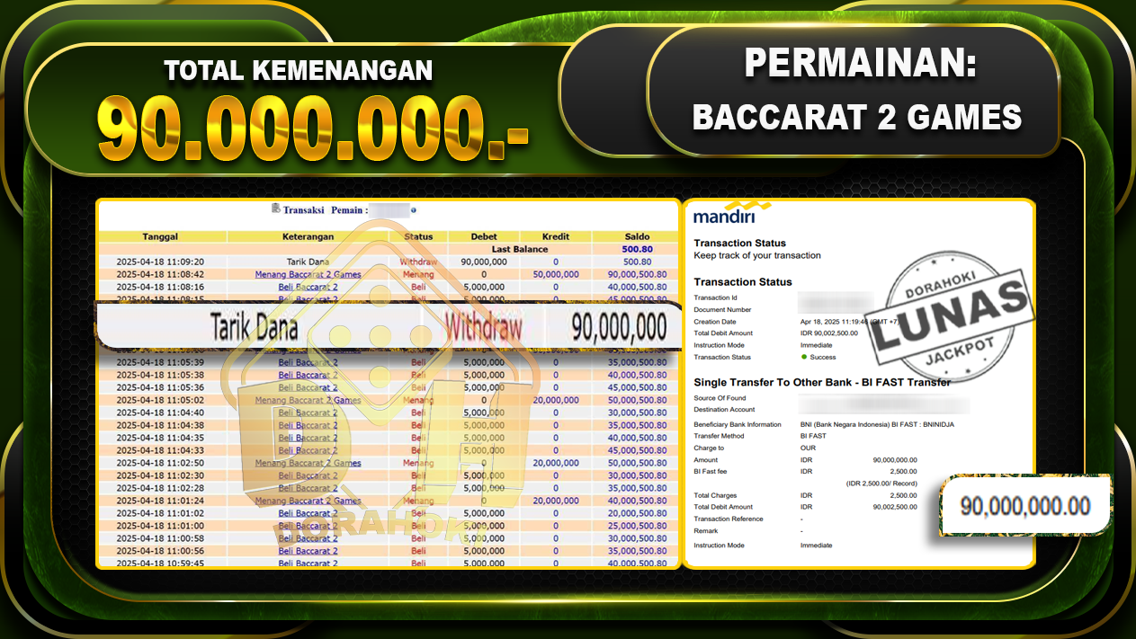 Bukti JP BACCARAT 2 GAMES – ucapkan selamat kepada user id Wahxxx atas kemenangan di BACCARAT 2 GAMES dengan total kemenangan Rp.90.000.000,- . Yang pasti nya langsung LUNAS sesuai bukti ya bosku. Dorahoki nih bosku berapapun akan tetap kami bayar lunas ya bosku.