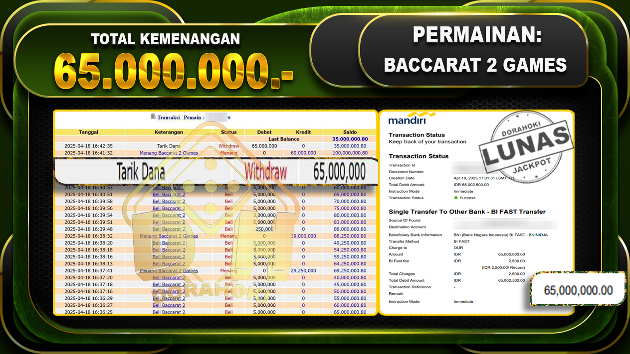 Bukti JP BACCARAT 2 GAMES – ucapkan selamat kepada user id Wahxxx atas kemenangan di BACCARAT 2 GAMES dengan total kemenangan Rp.65.000.000,- . Yang pasti nya langsung LUNAS sesuai bukti ya bosku. Dorahoki nih bosku berapapun akan tetap kami bayar lunas ya bosku.