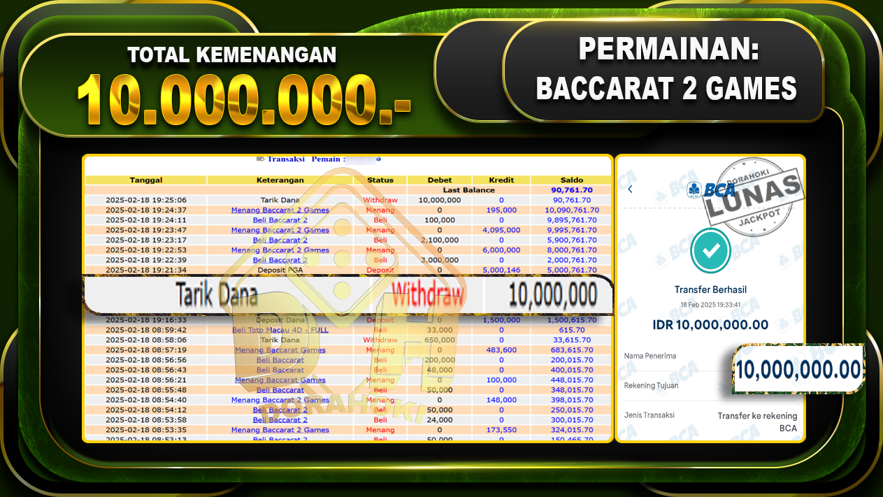 Bukti JP BACCARAT 2 GAMES – ucapkan selamat kepada user id luyxxx atas kemenangan di BACCARAT 2 GAMES dengan total kemenangan Rp.10.000.000,- . Yang pasti nya langsung LUNAS sesuai bukti ya bosku. Dorahoki nih bosku berapapun akan tetap kami bayar lunas ya bosku.