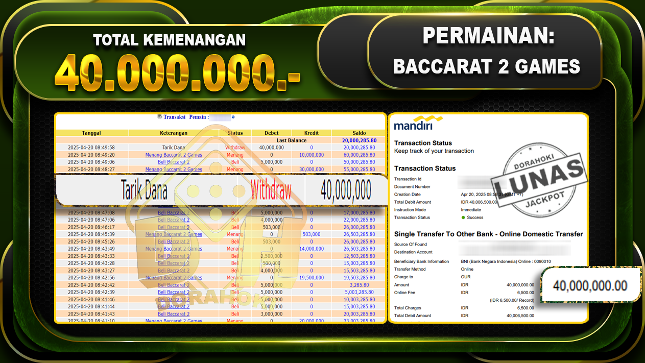 Bukti JP BACCARAT 2 GAMES – ucapkan selamat kepada user id Wahxxx atas kemenangan di BACCARAT 2 GAMES dengan total kemenangan Rp.40.000.000,- . Yang pasti nya langsung LUNAS sesuai bukti ya bosku. Dorahoki nih bosku berapapun akan tetap kami bayar lunas ya bosku.