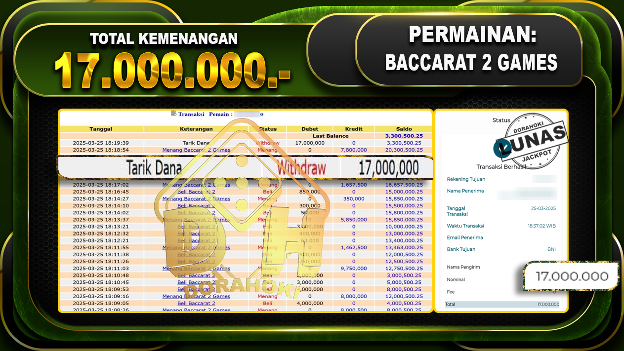 Bukti JP BACCARAT 2 GAMES – ucapkan selamat kepada user id Wahxxx atas kemenangan di BACCARAT 2 GAMES dengan total kemenangan Rp.17.000.000,- . Yang pasti nya langsung LUNAS sesuai bukti ya bosku. Dorahoki nih bosku berapapun akan tetap kami bayar lunas ya bosku.