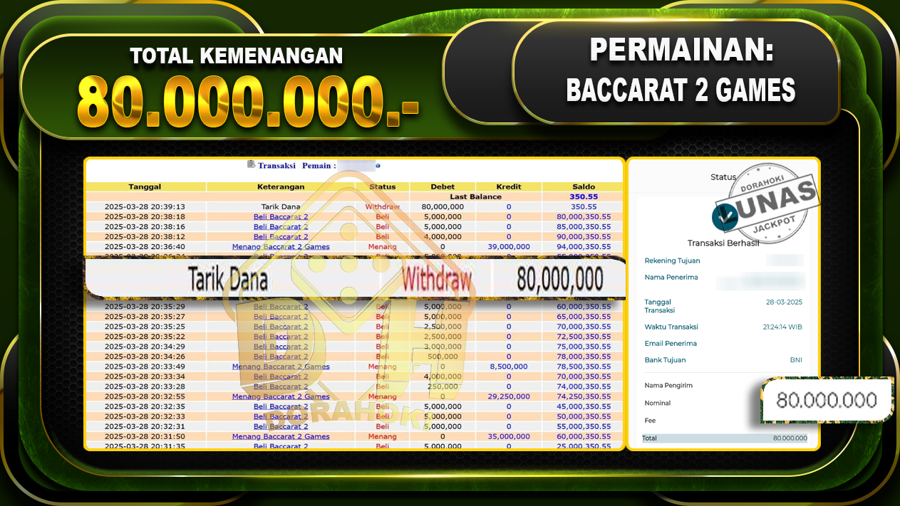 Bukti JP BACCARAT 2 GAMES – ucapkan selamat kepada user id Wahxxx atas kemenangan di BACCARAT 2 GAMES dengan total kemenangan Rp.80.000.000,- . Yang pasti nya langsung LUNAS sesuai bukti ya bosku. Dorahoki nih bosku berapapun akan tetap kami bayar lunas ya bosku.