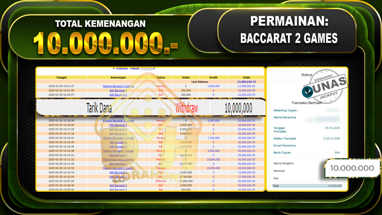 Bukti JP BACCARAT 2 GAMES – ucapkan selamat kepada user id Wahxxx atas kemenangan di BACCARAT 2 GAMES dengan total kemenangan Rp.10.000.000,- . Yang pasti nya langsung LUNAS sesuai bukti ya bosku. Dorahoki nih bosku berapapun akan tetap kami bayar lunas ya bosku.