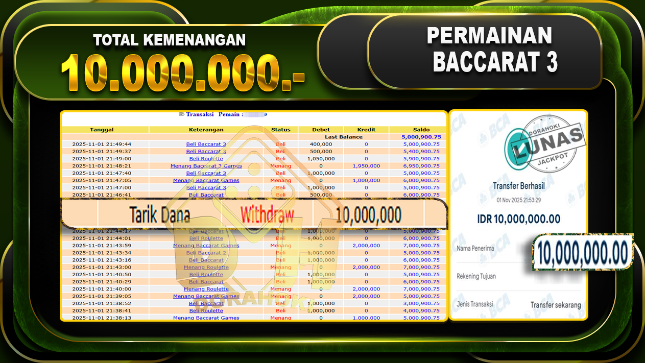 Bukti JP BACCARAT – ucapkan selamat kepada user id asuxxx atas kemenangan di BACCARAT dengan total kemenangan Rp.10.000.000,- . Yang pasti nya langsung LUNAS sesuai bukti ya bosku. Dorahoki nih bosku berapapun akan tetap kami bayar lunas ya bosku.