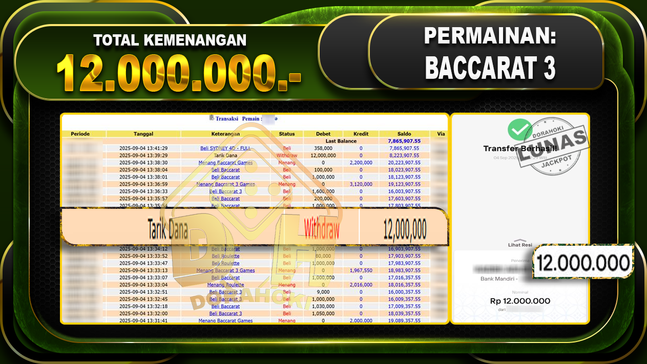 Bukti JP BACCARAT 3 GAMES – ucapkan selamat kepada user id Jixx atas kemenangan di BACCARAT 3 GAMES dengan total kemenangan Rp.12.000.000- . Yang pasti nya langsung LUNAS sesuai bukti ya bosku. Dorahoki nih bosku berapapun akan tetap kami bayar lunas ya bosku.