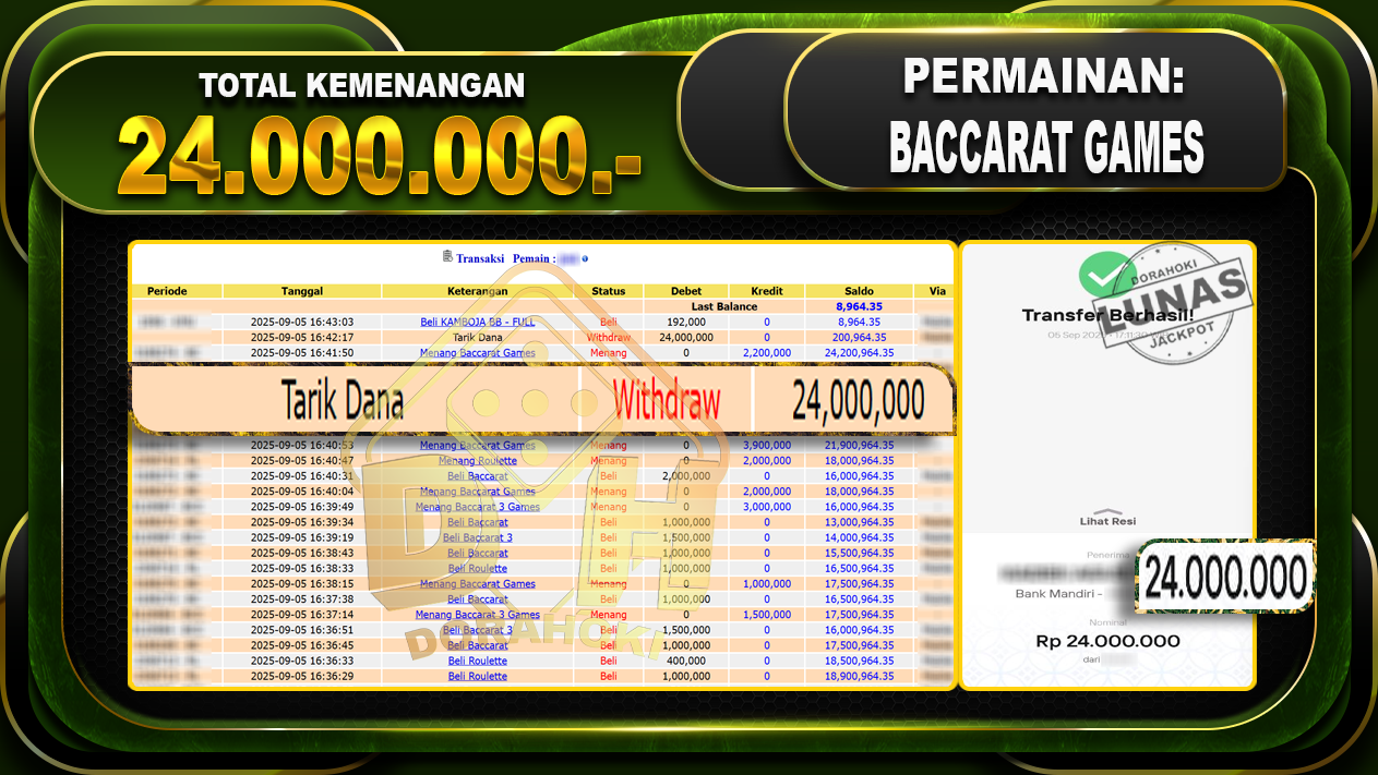 Bukti JP BACCARAT 3 GAMES – ucapkan selamat kepada user id Jilxx atas kemenangan di BACCARAT 3 GAMES dengan total kemenangan Rp.24.000.000,- . Yang pasti nya langsung LUNAS sesuai bukti ya bosku. Dorahoki nih bosku berapapun akan tetap kami bayar lunas ya bosku.