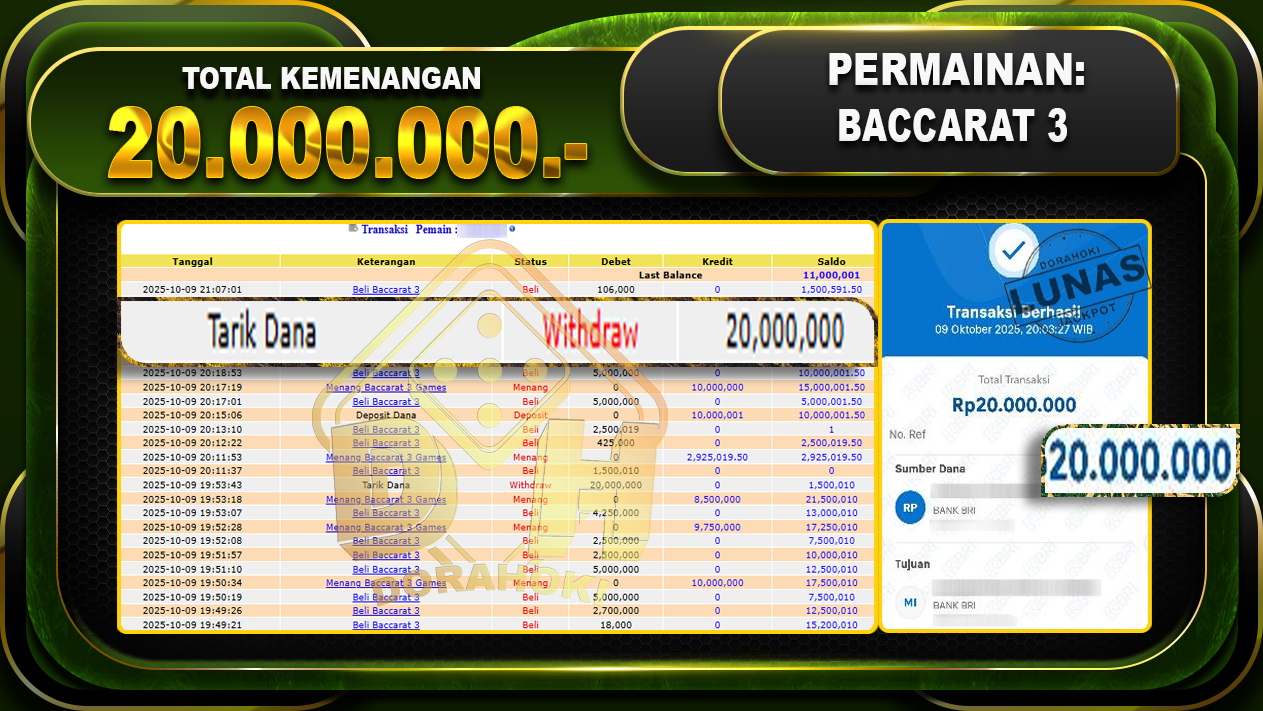 Bukti JP BACCARAT 3 GAMES – ucapkan selamat kepada user id arkhxxxx atas kemenangan di BACCARAT 3 GAMES dengan total kemenangan Rp.20.000.000,- . Yang pasti nya langsung LUNAS sesuai bukti ya bosku. Dorahoki nih bosku berapapun akan tetap kami bayar lunas ya bosku.