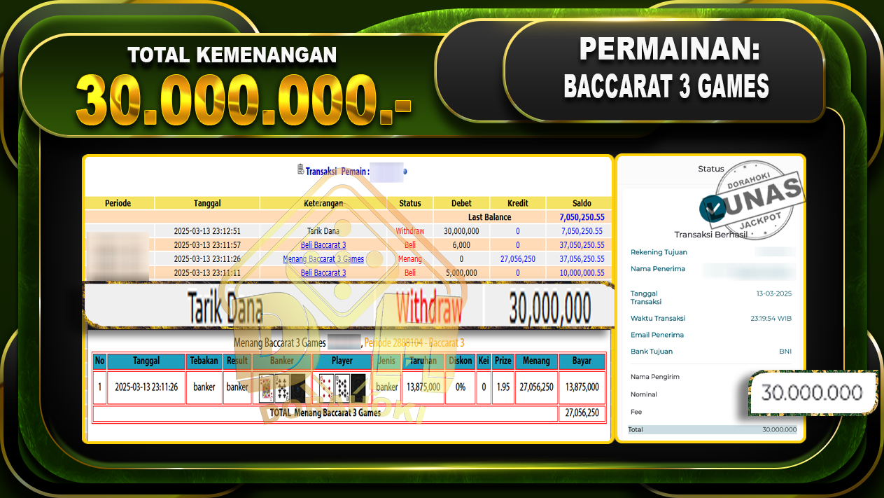 Bukti JP BACCARAT 3 GAMES – ucapkan selamat kepada user id Wahxxx atas kemenangan di BACCARAT 3 GAMES dengan total kemenangan Rp.30.000.000,- . Yang pasti nya langsung LUNAS sesuai bukti ya bosku. Dorahoki nih bosku berapapun akan tetap kami bayar lunas ya bosku.
