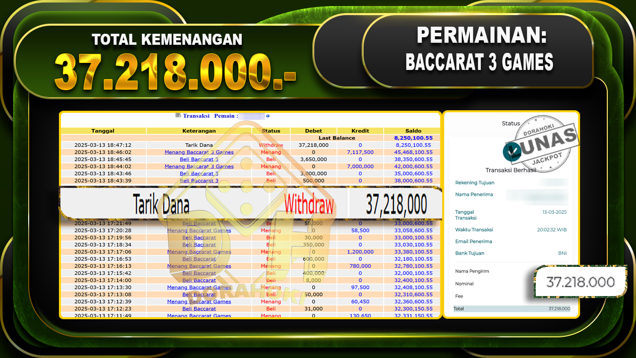 Bukti JP BACCARAT 3 GAMES – ucapkan selamat kepada user id Wahxxx atas kemenangan di  BACCARAT 3 GAMES dengan total kemenangan Rp.37.218.000,- . Yang pasti nya langsung LUNAS sesuai bukti ya bosku. Dorahoki nih bosku berapapun akan tetap kami bayar lunas ya bosku.