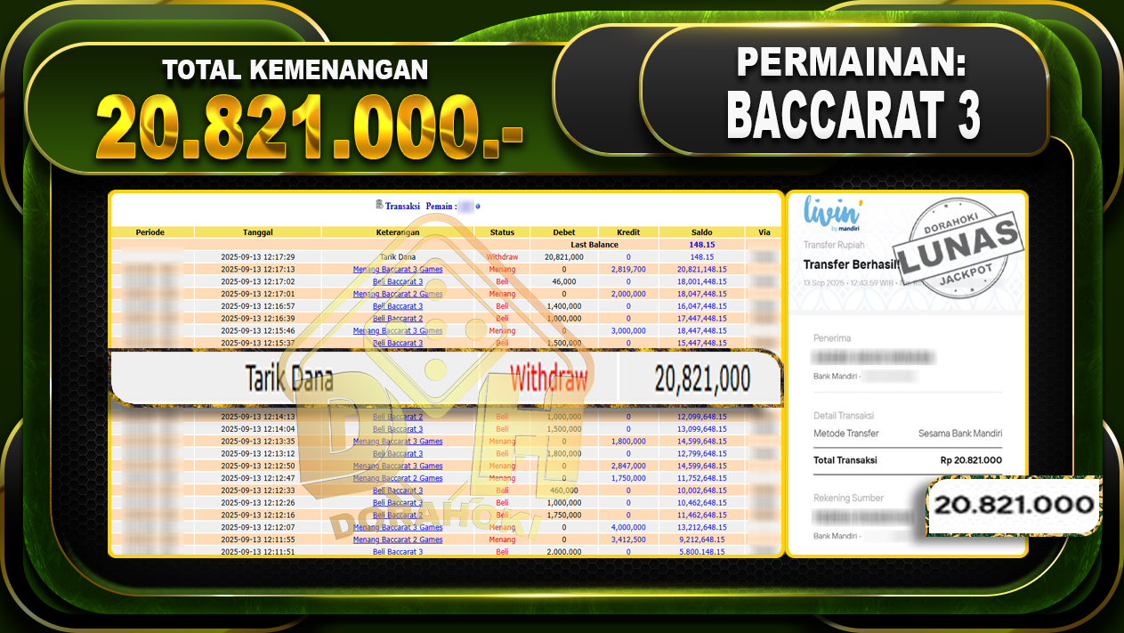 Bukti JP BACCARAT 3 GAMES – ucapkan selamat kepada user id Jixx atas kemenangan di BACCARAT 3 GAMES dengan total kemenangan Rp.20.821.000,- . Yang pasti nya langsung LUNAS sesuai bukti ya bosku. Dorahoki nih bosku berapapun akan tetap kami bayar lunas ya bosku.