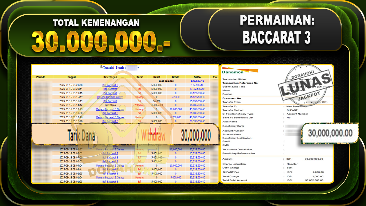 Bukti JP BACCARAT 3 GAMES – ucapkan selamat kepada user id Arkxxxx atas kemenangan di BACCARAT 3 GAMES   dengan total kemenangan Rp.30.000.000,- . Yang pasti nya langsung LUNAS sesuai bukti ya bosku. Dorahoki nih bosku berapapun akan tetap kami bayar lunas ya bosku.
