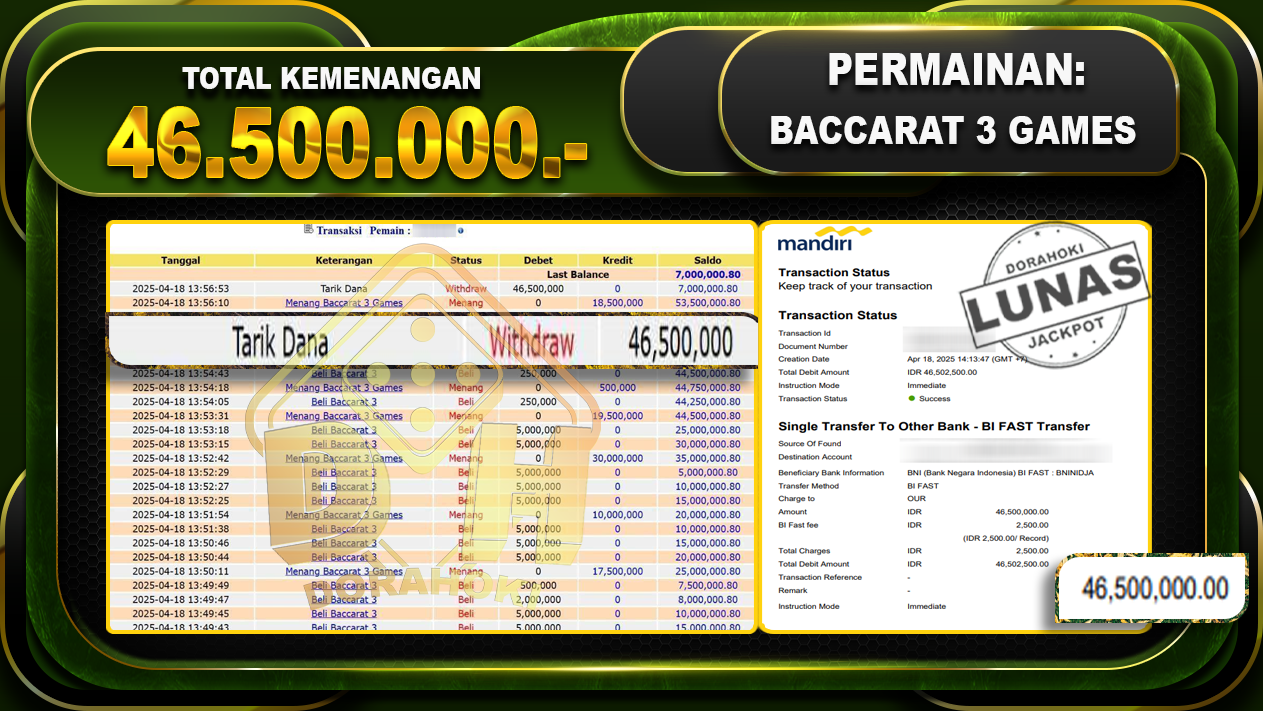 Bukti JP BACCARAT 3 GAMES – ucapkan selamat kepada user id Wahxxx atas kemenangan di BACCARAT 3 GAMES dengan total kemenangan Rp.46.500.000,- . Yang pasti nya langsung LUNAS sesuai bukti ya bosku. Dorahoki nih bosku berapapun akan tetap kami bayar lunas ya bosku.