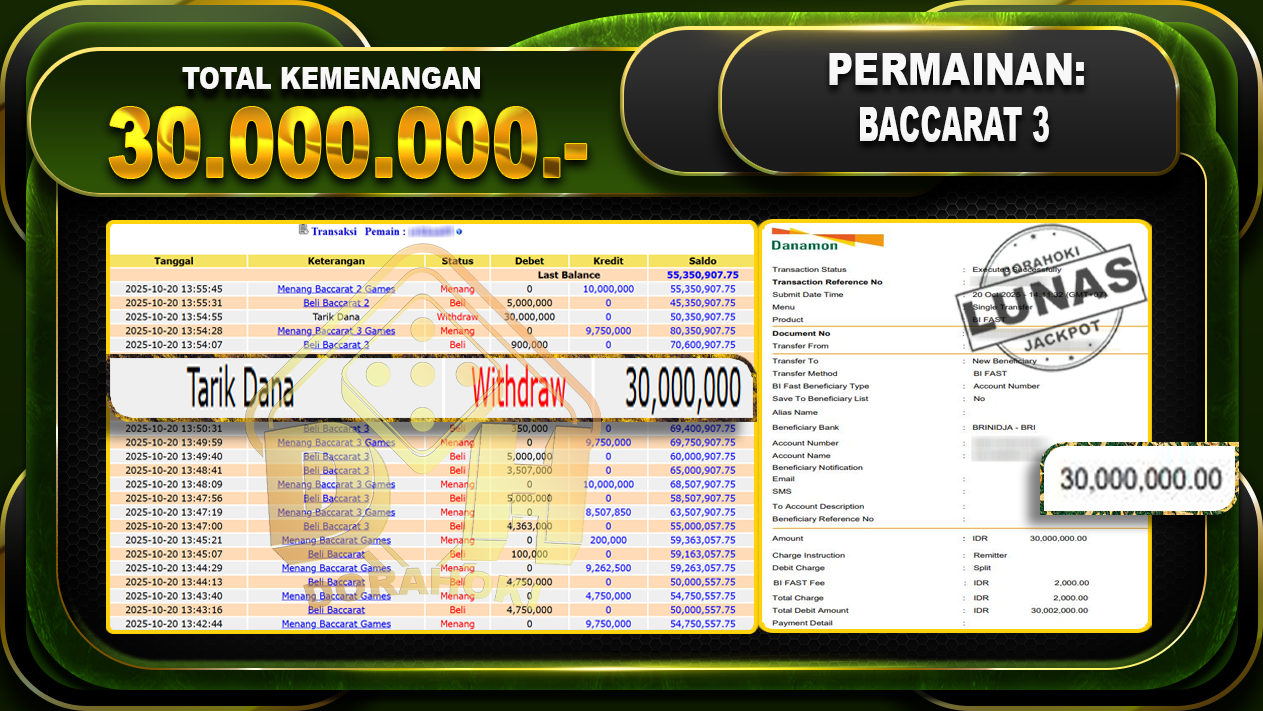 Bukti JP BACCARAT 3 GAMES – ucapkan selamat kepada user id Arkhxxxx atas kemenangan di BACCARAT 3 GAMES dengan total kemenangan Rp.30,000,000,- . Yang pasti nya langsung LUNAS sesuai bukti ya bosku. Dorahoki nih bosku berapapun akan tetap kami bayar lunas ya bosku.