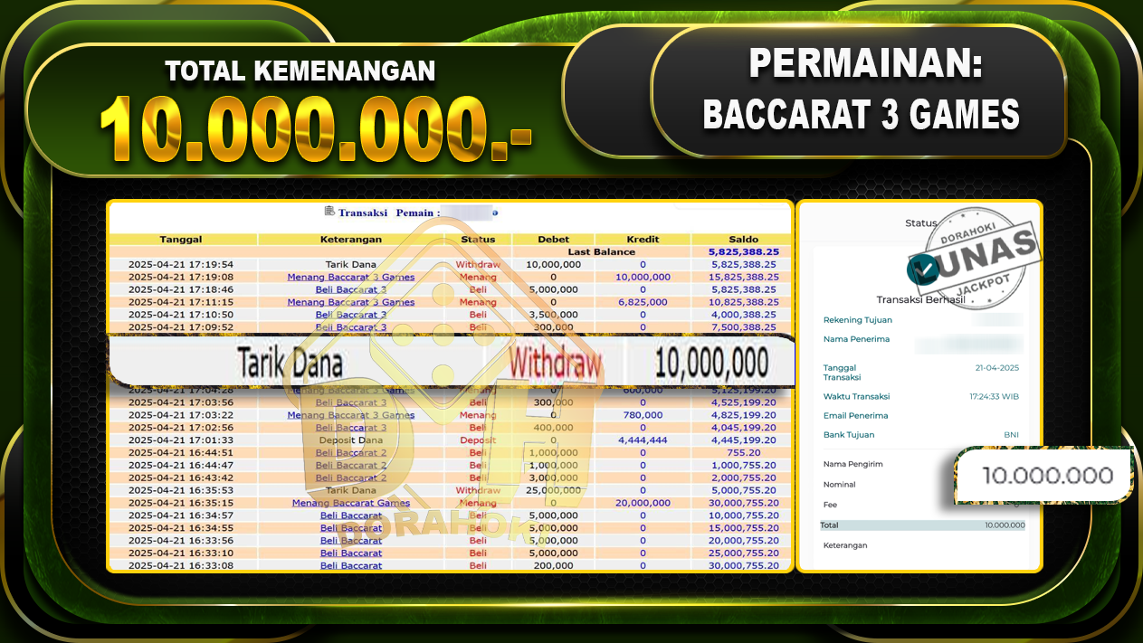 Bukti JP BACCARAT 3 GAMES – ucapkan selamat kepada user id Wahxxx atas kemenangan di BACCARAT 3 GAMES dengan total kemenangan Rp.10.000.000,- . Yang pasti nya langsung LUNAS sesuai bukti ya bosku. Dorahoki nih bosku berapapun akan tetap kami bayar lunas ya bosku.