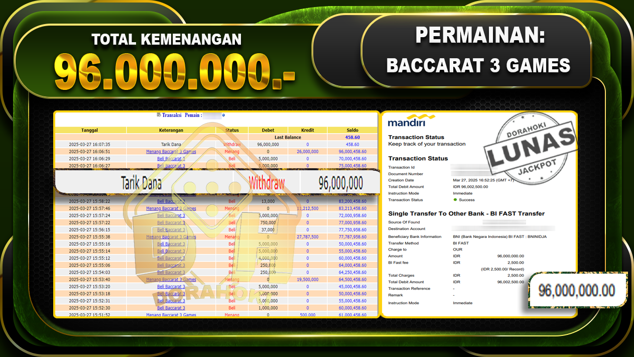 Bukti JP BACCARAT 3 GAMES – ucapkan selamat kepada user id Wahxxx atas kemenangan di BACCARAT 3 GAMES dengan total kemenangan Rp.96.000.000,- . Yang pasti nya langsung LUNAS sesuai bukti ya bosku. Dorahoki nih bosku berapapun akan tetap kami bayar lunas ya bosku.
