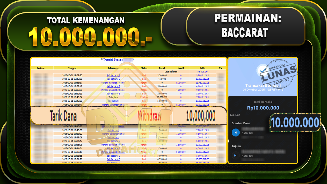 Bukti JP Baccarat – ucapkan selamat kepada user id arkhxxxxx atas kemenangan di Baccarat dengan total kemenangan Rp.10.000.000- . Yang pasti nya langsung LUNAS sesuai bukti ya bosku. Dorahoki nih bosku berapapun akan tetap kami bayar lunas ya bosku.