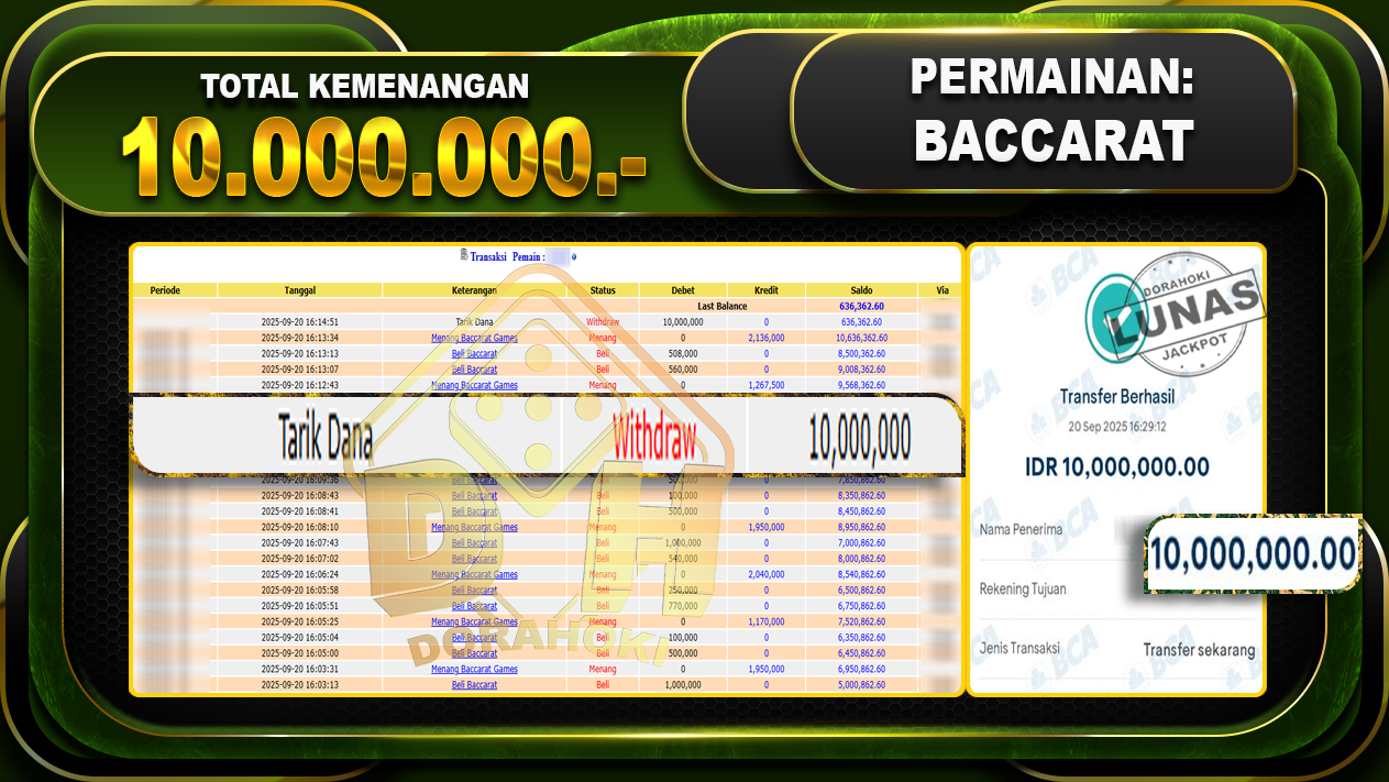 Bukti JP Baccarat – ucapkan selamat kepada user id Asuxxxx atas kemenangan di Baccarat dengan total kemenangan Rp.10.000.000- . Yang pasti nya langsung LUNAS sesuai bukti ya bosku. Dorahoki nih bosku berapapun akan tetap kami bayar lunas ya bosku.